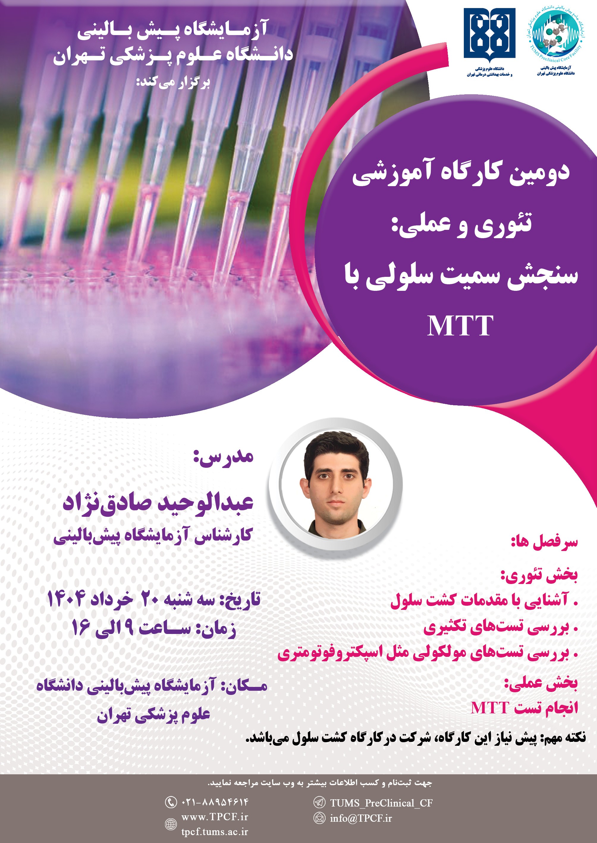 با توجه به نکات و جزئیات این تست، آزمایشگاه پیش بالینی تصمیم گرفته تا تستMTT را در قالب یک کارگاه سه روزه به محققان علاقه مند آموزش دهد.